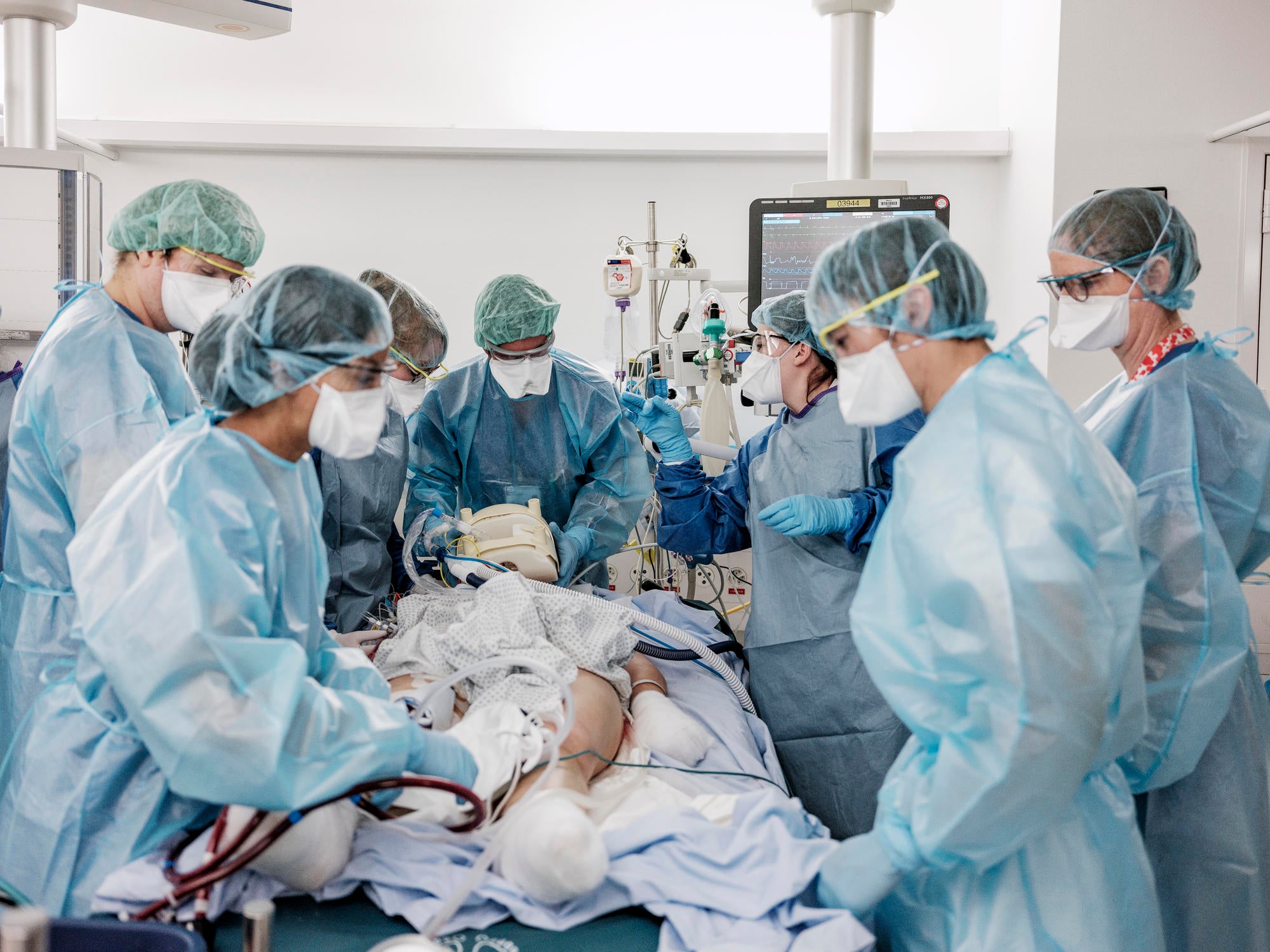 About 20 percent of symptomatic people develop a severe form of COVID-19 characterized by difficulty breathing or pneumonia. These patients require hospitalization and oxygen support, and about 25 percent go on to need intensive care to stave off or treat acute respiratory distress syndrome, a potentially fatal form of lung failure. Beyond its respiratory effects, COVID-19 can damage other organs, including the heart, blood vessels, and kidneys. It can also cause an excessive immune response called a cytokine storm, when the immune system attacks healthy tissue and occasionally leading to multiple organ failure.