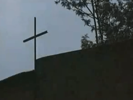 White flag with red logo of Doctors Without Borders/Médecins Sans Frontières (MSF) against sunny blue sky
