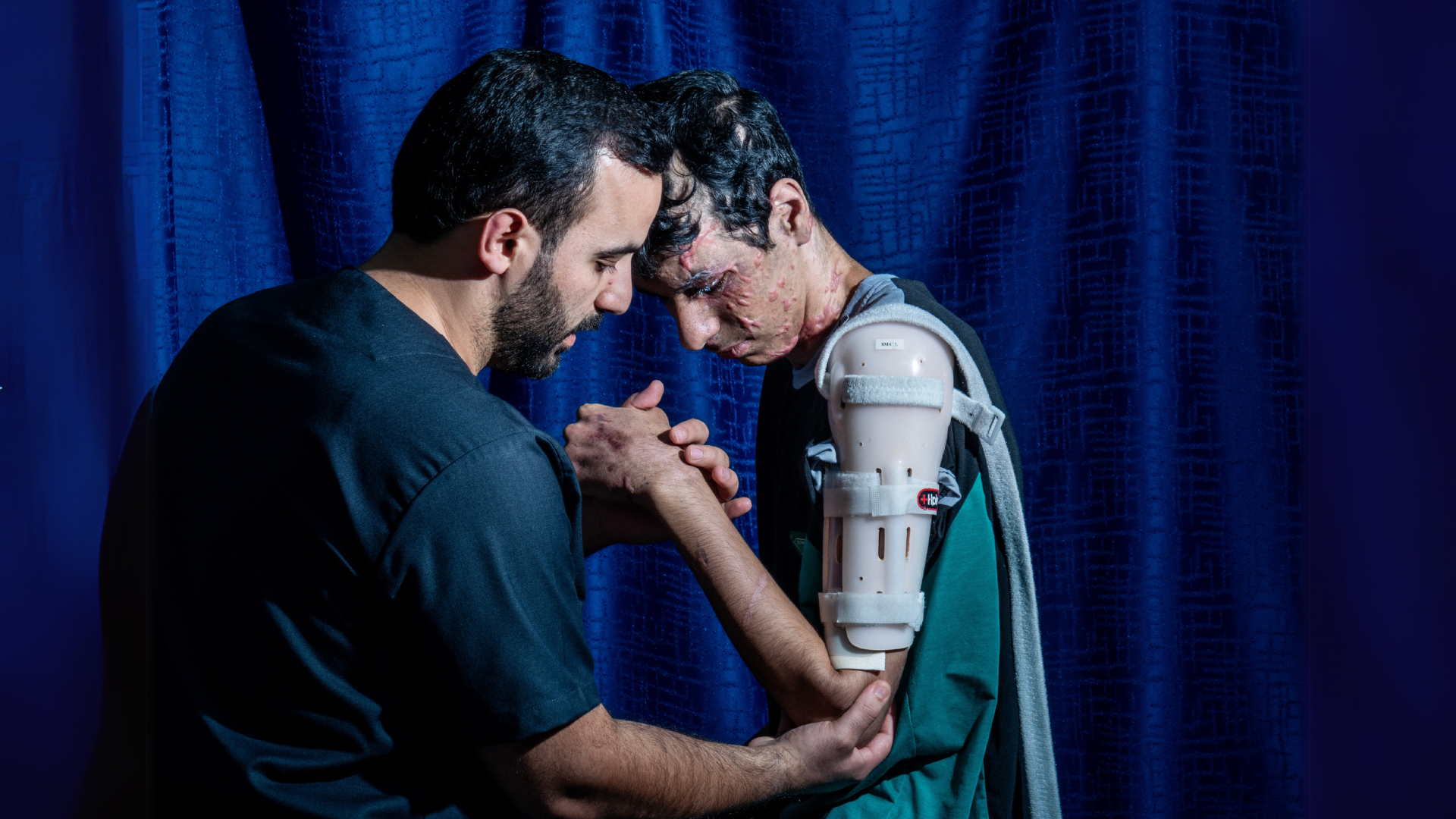 As streaks of sunlight beam through the small window of a sterile hospital room, warm orange lines fall on 17-year-old Karam’s face, highlighting ridges of white scars across his left cheek. As he slowly sits up, he uses his right hand to strap a long piece of skin-colored plastic onto his upper left arm.